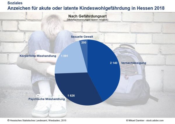 In Hessen wurden im Jahr 2018 knapp 12 500 Gefährdungseinschätzungen nach § 8a des Achten Buches Sozialgesetzbuch (SGB VIII – Kinder- und Jugendhilfe) durchgeführt. Wie das Hessische Statistische Landesamt mitteilt, waren dies 16 Prozent mehr als im Jahr 2017. Mädchen waren geringfügig häufiger von Gefährdungseinschätzungen betroffen als Jungen.[..] Weiter statistik.hessen.de