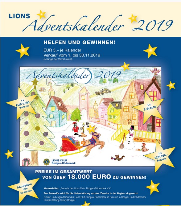 Der Reihe nach: Der Lions Club Rodgau-Rödermark verkauft in diesem Jahr erstmals einen ganz besonderen Adventskalender, der von ihm selbst entworfen wurde: Jeder dieser Kalender trägt eine einzigartige Losnummer, und vom 1. bis zum 24. Dezember 2019 werden Tag-für-Tag zahlreiche wertvolle Preise verlost. Welche das sind, wird immer hinter dem Türchen des jeweiligen Tages verraten. Die unter notarieller Aufsicht ermittelten Glücksnummern werden täglich bekannt gegeben: In der Offenbach-Post und auf der Internetseite des Lions Clubs: www.lc-rodgau-roedermark.de können die Kalenderbesitzer gleich erfahren, ob sie zu den Gewinnern des Tages gehören. Weiter bei roedermark.de