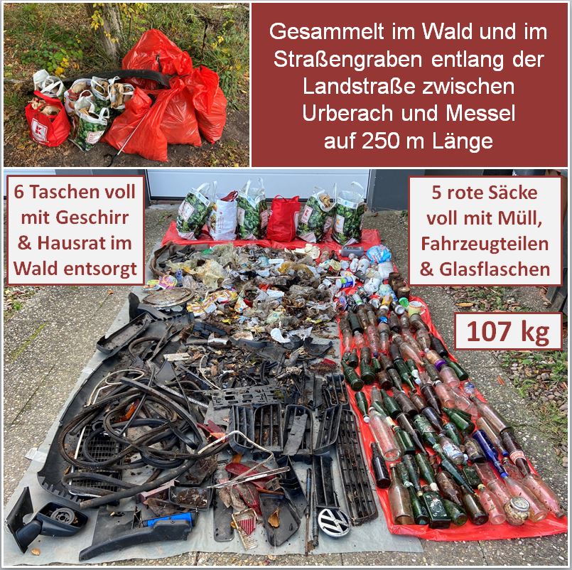 Dritter Teil der Reinigung der Landstraße und dem angrenzenden Wald zwischen Urberach und Messel. Auf den ersten 1,6 km hatte ich bereits 200 kg Müll gesammelt. Gestern waren es noch einmal 107 kg auf einer Strecke von 250 m.