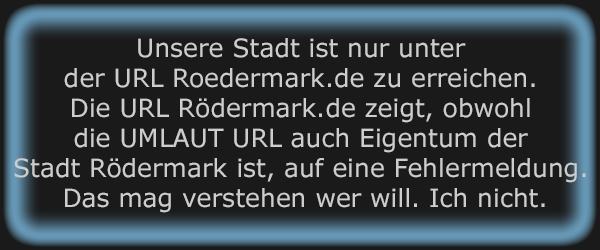 Obwohl es mir persönlich völlig Wurst ist, ob die Stadt unter roedermark.de und/oder rödermark.de zu erreichen ist, habe ich mich „breittreten“ lassen und unter vielen Artikeln darauf hingewiesen.