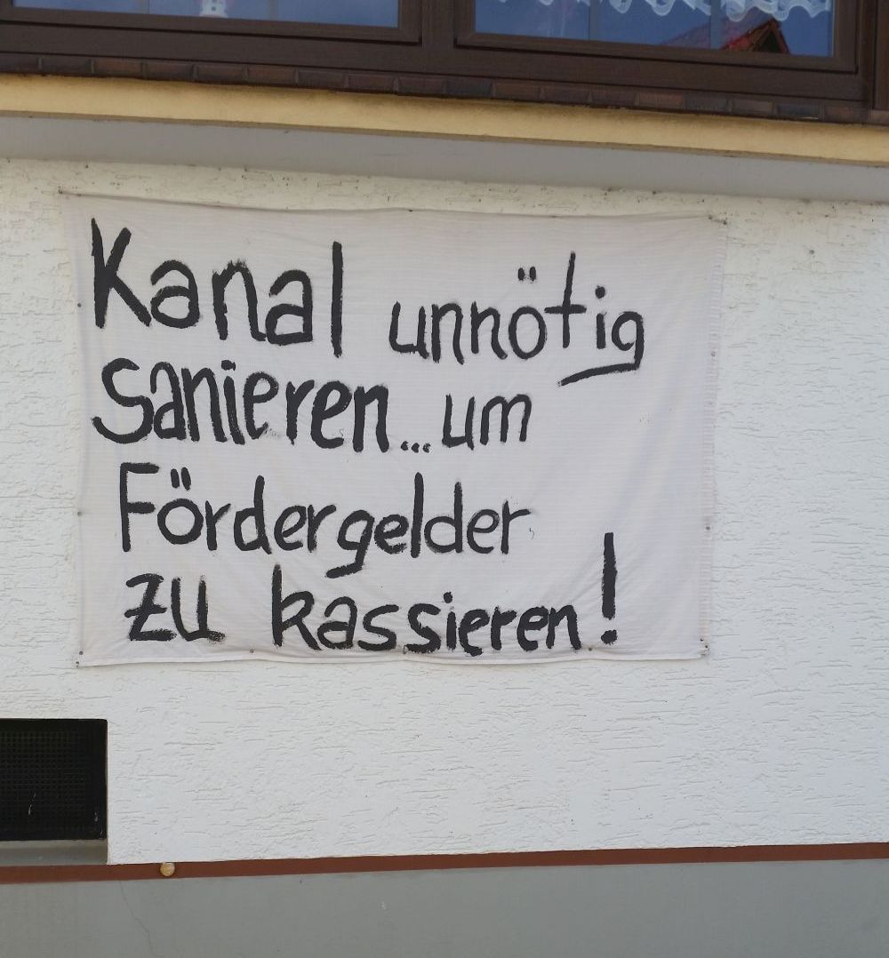Es wurde kurz und knapp das bestätigt, was auf dem Plakat steht. „Kanal war nicht nötig. Es gab aber Fördergelder.“ Kommt mir bekannt vor. Man beantragT Fördergelder, bekommt den Zuschlag und dann geht es krampfhaft auf die Suche nach Projekten, wo man die Fördergelder verpulvern kann. Man muss wissen, Fördergelder belasten ganz gewaltig die Gemeindekasse. Bei z.B. 10.000.000,00 € Gesamtsumme können es leicht 3.000.000,00 € Gemeinde-/Stadtanteil werden.