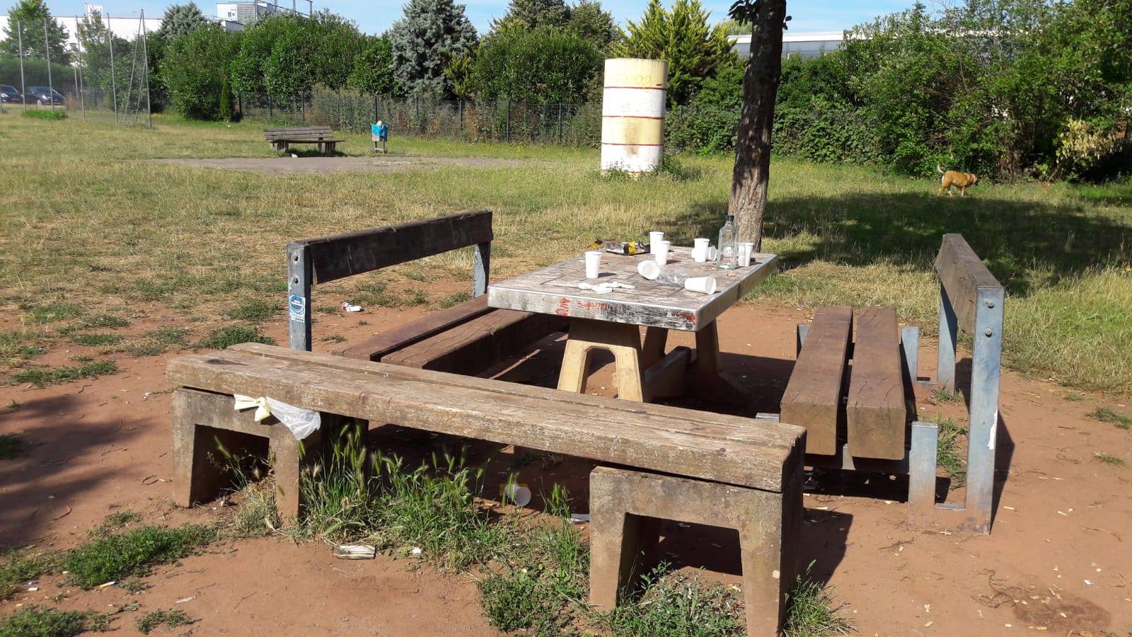 Der Müll wurde von mir an einer anderen Bank, bei der ein Abfalleimer angebracht ist, entsorgt. Schön reingedrückt war dann der Abfalleimer nicht einmal zur Hälfte gefüllt.
