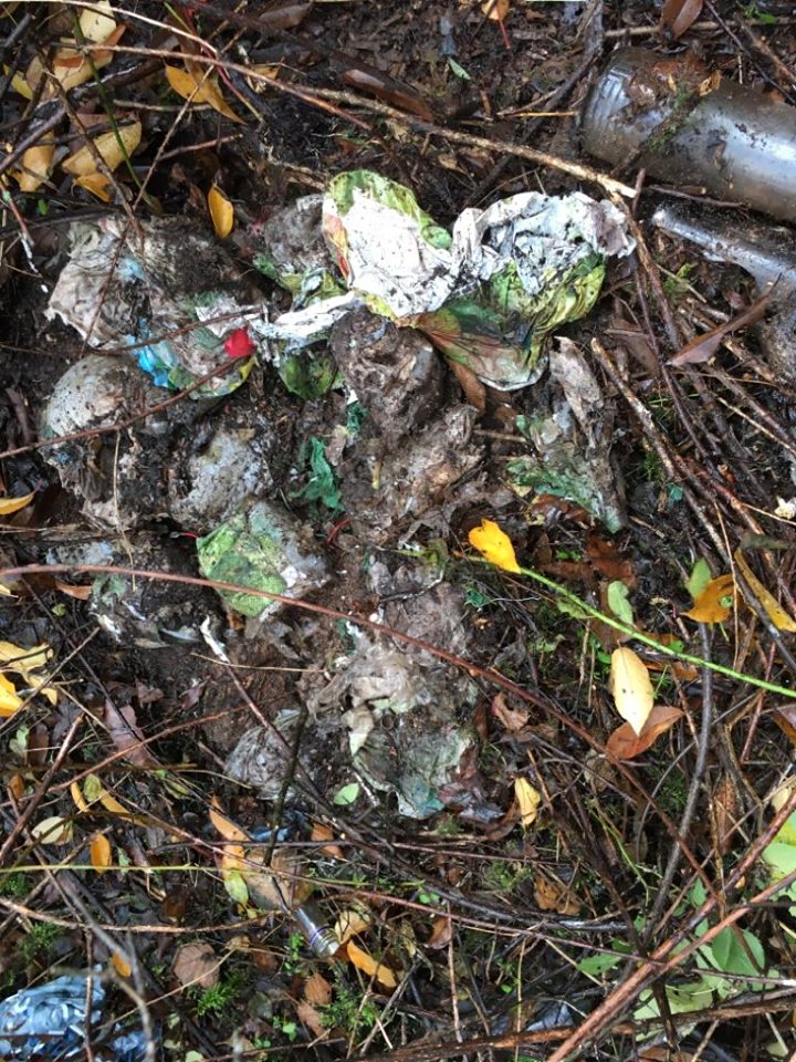 Das Foto zeigt den eingesammelten Müll, der durch den starken Wind weit in den Wald verstreut wurde. Kein schöner Anblick. Aber auch nicht übermäßig viel Müll. Man kann annehmen, dass der Verpackungsmüll den Weg in einen Abfalleimer gefunden hätte, wenn einer dagewesen wäre. Nehmen wir das einfach mal so an. Das Gegenteil kann man nicht behaupten.