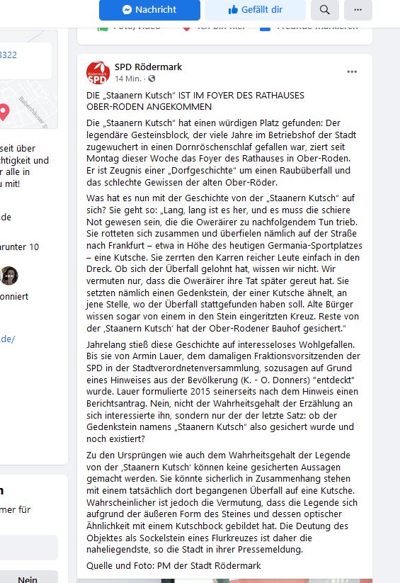 Und Rödermark? Rödermark hat auch so eine wunderschöne Geschichte und will aber scheinbar nicht, dass die weiter verbreitet und erzählt wird. Eine wahre Geschichte, die sich anhand des noch vorhandenen Gedenksteins „Staanern Kutsch“ beweisen lässt. Eine wirklich wahre Geschichte die von Herrn Reisert niedergeschrieben wurde. Wahre Geschichte? Nun ja. Bürgermeister Kern ist dieser Sache leider wissenschaftlich nachgegangen und hat dann etwas zu Tage fördern lassen, was eigentlich keinem so gefallen konnte. Aber sind wir einmal ehrlich, wem glauben Sie mehr? Frau Dietrich, die die Staanern Kutsch im Auftrag der Stadt wissenschaftlich untersucht hat oder doch lieber unserm Geschichtenschreiber Adam Reisert?