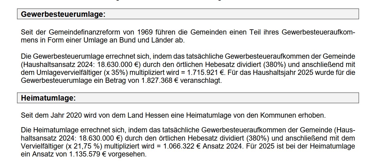 Wenn Rödermark 16 Mio. Euro an Gewerbesteuer einnimmt, muss die Stadt etwa 915.800 Euro als Heimatumlage abführen. Die durch die Heimatumlage eingenommenen Mittel werden den Kommunen beispielsweise über Förderprogramme (bürokratischer Aufwand) wieder zur Verfügung gestellt.