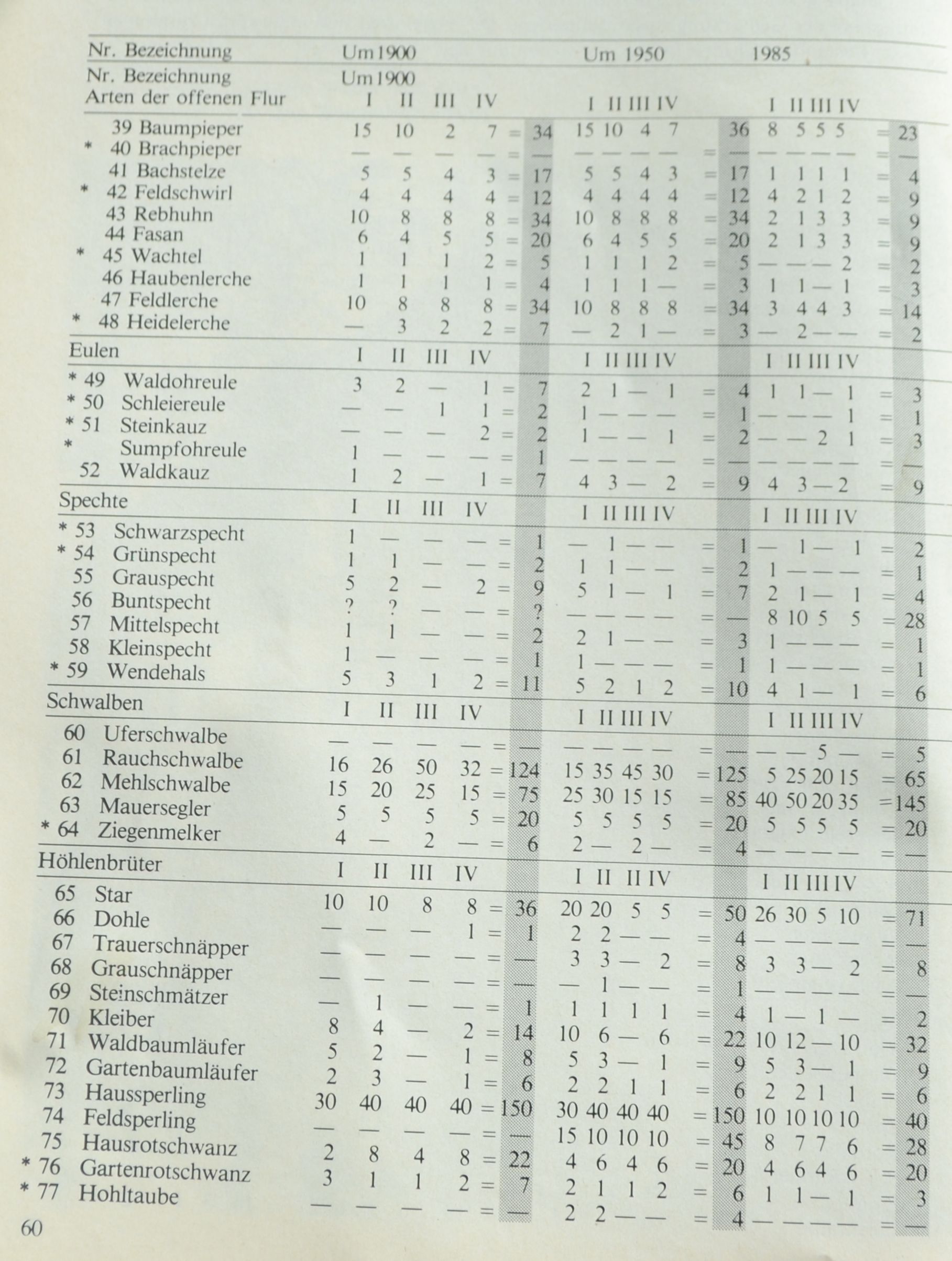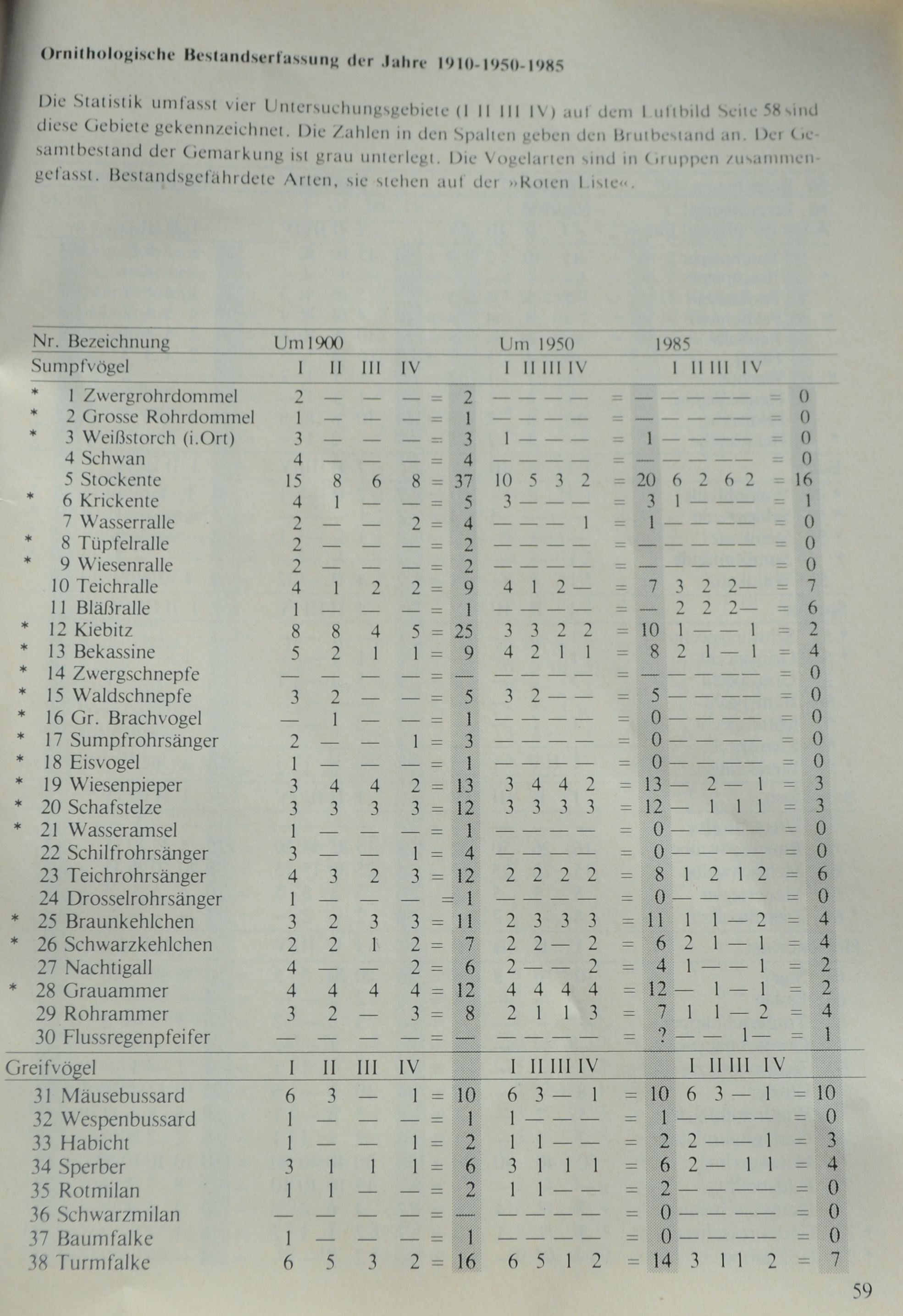 Ornithologische Bestandserfassung der Jahre 1910, 1950 und 1985. Quelle. Flurchronik von Ober-Roden. DBV