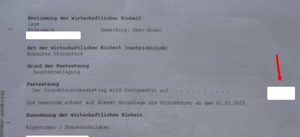 Dem Grundsteuerbescheid der Stadt Rödermark entnehmen Sie den aktuellen Messbetrag (unter neuer Messbetrag). Sie finden diesen links neben der aktuellen Hebesatzangabe von 715%. Multiplizieren Sie diesen Satz mit dem 7,15 (auf das Komma achten). Sie erhalten dann den Gesamtbetrag, den Sie pro Jahr zu zahlen haben.