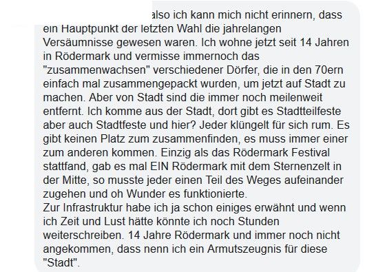 Wenn ich das richtig verstanden habe, dann wurde Rödermark auf politischer/verwaltungstechnischer Ebene gegründet. Das heißt, die Dörfer sind nicht von sich aus zusammengewachsen. Erinnert mich an die EU. In Rödermark kommt wohl noch dazu, dass die alten Dorfstrukturen neben mehreren neuen Strukturen an Zugezogenen aus Deutschland und aller Welt bestehen. Rödermark ist vermutlich zu schnell gewachsen. Diese Situation macht es vermutlich noch schwieriger, dass sich eine neue und einheitliche Rödermärker Identität und Zusammengehörigkeit ausbilden kann. Ich möchte die Situation in Rödermark allerdings nicht als Versagen der Stadtverwaltung bezeichnen, nur weil ich mich in Rödermark nicht sonderlich zuhause fühle. Dabei sind die alten und die neuen Rödermärker eigentlich wirklich nett und freundlich und wenn man sich hier einem Verein oder der Kirche anschließt, dann kann man Freunde für’s Leben finden.