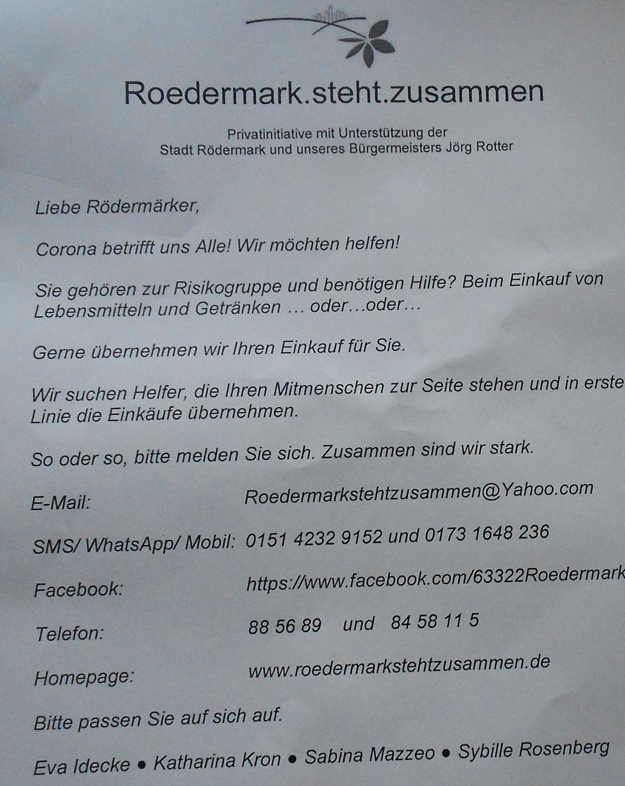 Aufgrund der aktuellen Lage bezüglich des Coronavirus und der weiteren Entwicklung, kann es im Besonderen bei älteren Personen zu kritischen Situationen kommen und hilfreich sein Unterstützung bei Einkäufen o.ä. zu haben. Getreu unserem Grundsatz „Vom Nebeneinander im Miteinander zum Füreinander“ sind wir für Sie da! Sie wissen wie Sie uns erreichen.