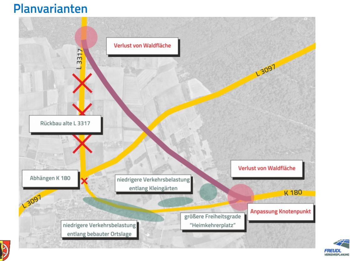 Ist mit „Rückbau alte L3317“ gleichzusetzen mit „Entfernen“ des in der Planvariante eingezeichneten Bereichs? Was ist mit „Abhängen K180“ gemeint? Wie kommt man aus Messel auf die L3097 in Richtung Darmstadt?