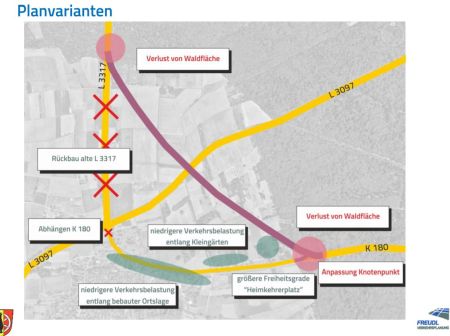 Für beide Planvarianten ist ein Straßenneubau von 1,7 km mit einem neuen Knotenpunkt notwendig (Schlenker).