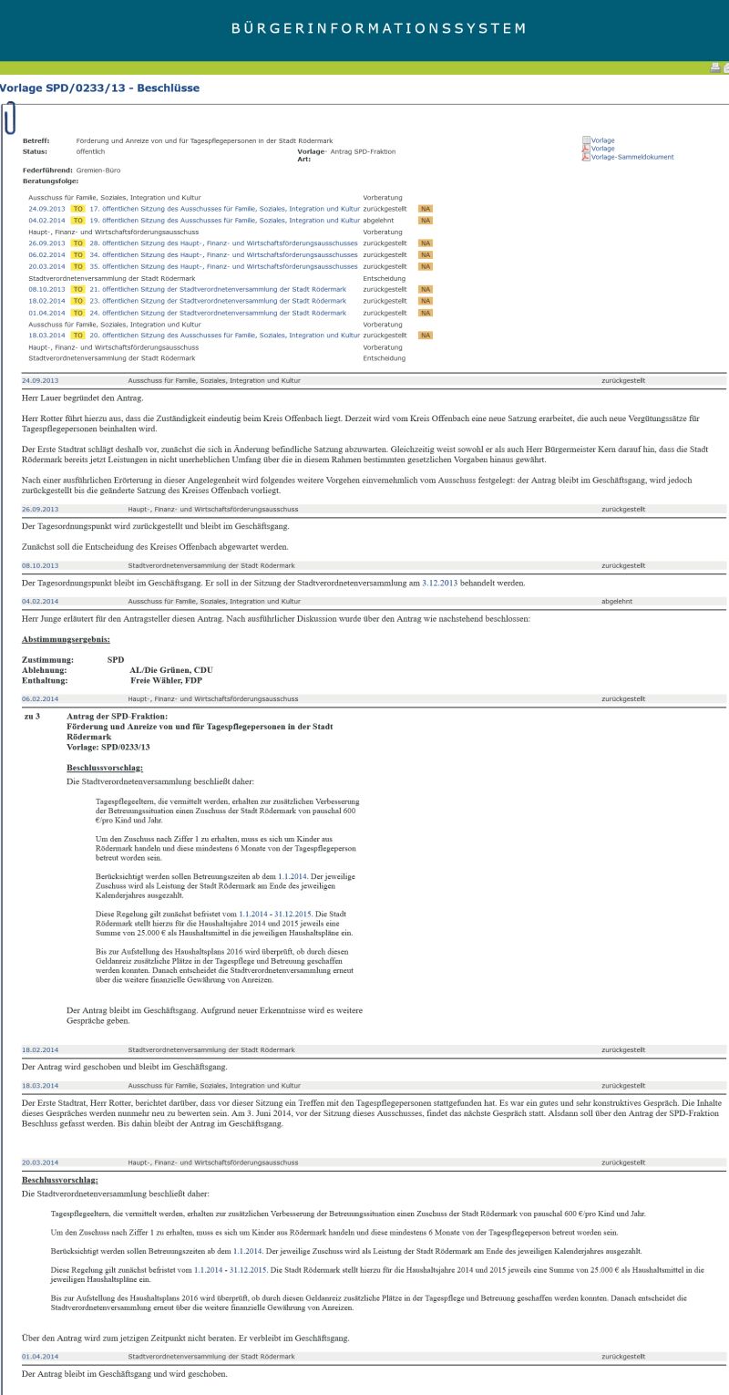 18.03.2014. Der Erste Stadtrat, Herr Rotter, berichtet darüber, dass vor dieser Sitzung ein Treffen mit den Tagespflegepersonen stattgefunden hat. Es war ein gutes und sehr konstruktives Gespräch. Die Inhalte dieses Gespräches werden nunmehr neu zu bewerten sein. Am 3. Juni 2014, vor der Sitzung dieses Ausschusses, findet das nächste Gespräch statt. Alsdann soll über den Antrag der SPD-Fraktion Beschluss gefasst werden. Bis dahin bleibt der Antrag im Geschäftsgang. Quelle