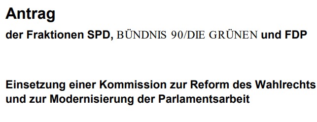 Der Deutsche Bundestag hat am 16. März 2022 auf Antrag der Fraktionen der SPD, Bündnis 90/Die Grünen und FDP (20/1023) die Einsetzung einer Kommission zur Reform des Wahlrechts und zur Modernisierung der Parlamentsarbeit beschlossen. Dies ist dem Deutschen Bundestag in § 55 des Bundeswahlgesetzes aufgegeben.