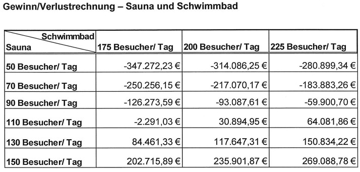 Betrachten Sie einmal die Spalte mit den Besuchern im Badehaus. Hier ist mit nicht mehr als 225 Besuchern gerechnet worden. Es sind aber 100 mehr geworden. Da ich keine Zahlen zu der Anzahl der Saunabesucher pro Tag habe, nehmen wir einfach einmal nur 110 pro Tag an. 2009 waren es 63 Saunabesucher p. Tag. Dann hätten wir ein Plus von ca. 64.000,00 Minus von ca. 200.000,00 Euro gemacht. Da wir jetzt aber ca. 100 Besucher pro Tag mehr haben, kämen da noch ca. hinzu: 100 Besucher * 300 Tage * 2,00 angenommener Schnitt Eintrittspreis. Das macht nicht wissenschaftlich 60.000,00 Euro PLUS.