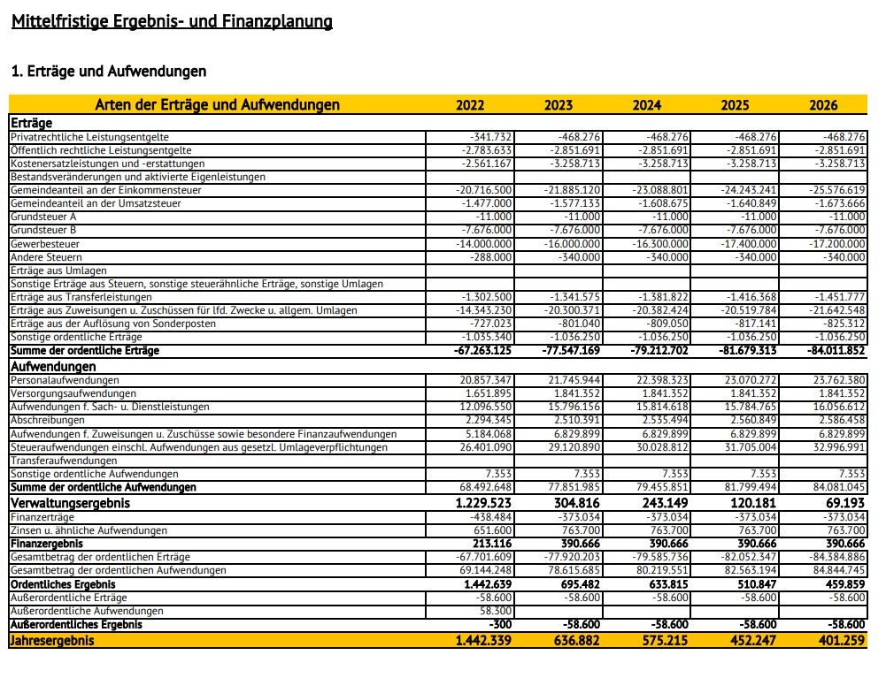 von 68.492.648 auf 84.081.494 in 2026. Laut Entwurf Haushaltsplan 2023 rechnet man, trotz der hohen Steigerung, in der Planung 2026 mit einem Fehlbedarf von nur 459.859,00€. Planung 2023 695.482,00€. Siehe Entwurf Haushaltsplan 2023 Seite 39.