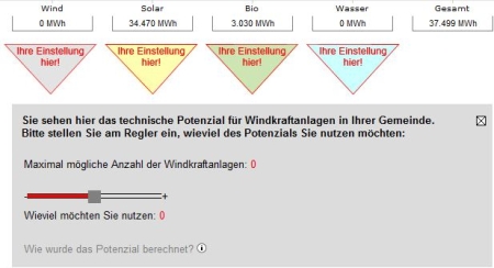 Der Online-Rechner ERNEUERBAR KOMM! stellt eine moderne und transparente Form der Bürgerbeteiligung dar. Jeder Bürger kann sich objektiv über die Erneuerbaren-Energie-Potenziale seiner Gemeinde informieren und Berechnungen und Szenarien selbst durchführen.