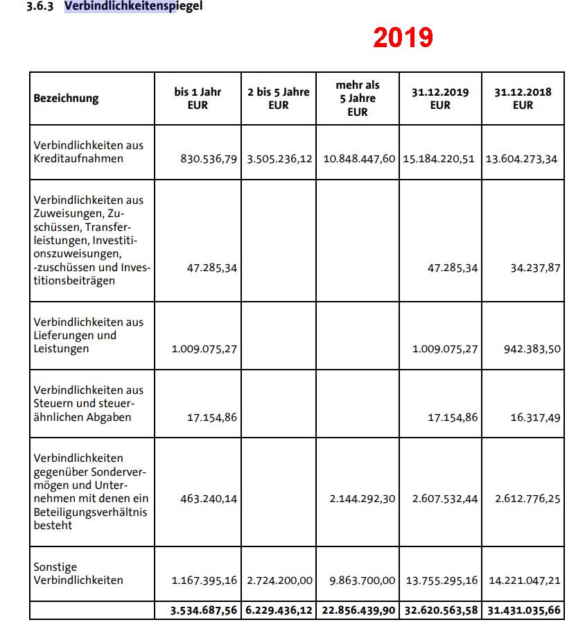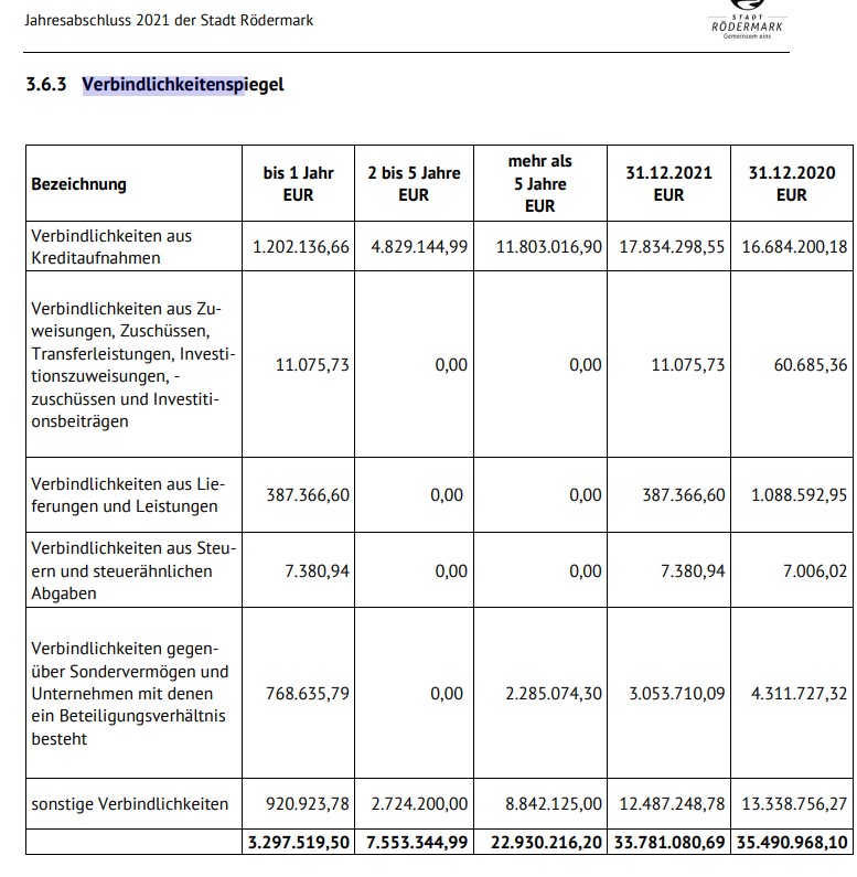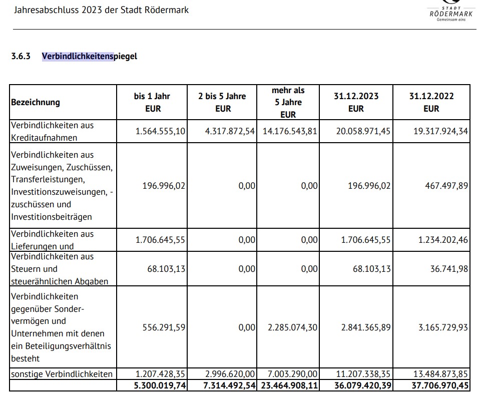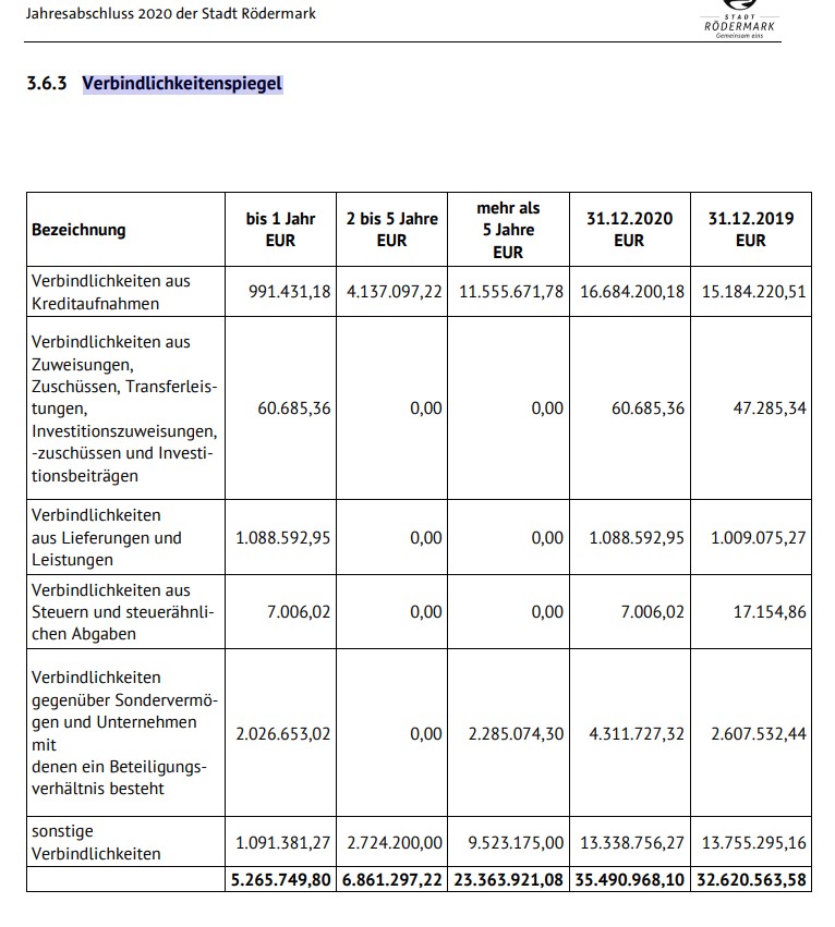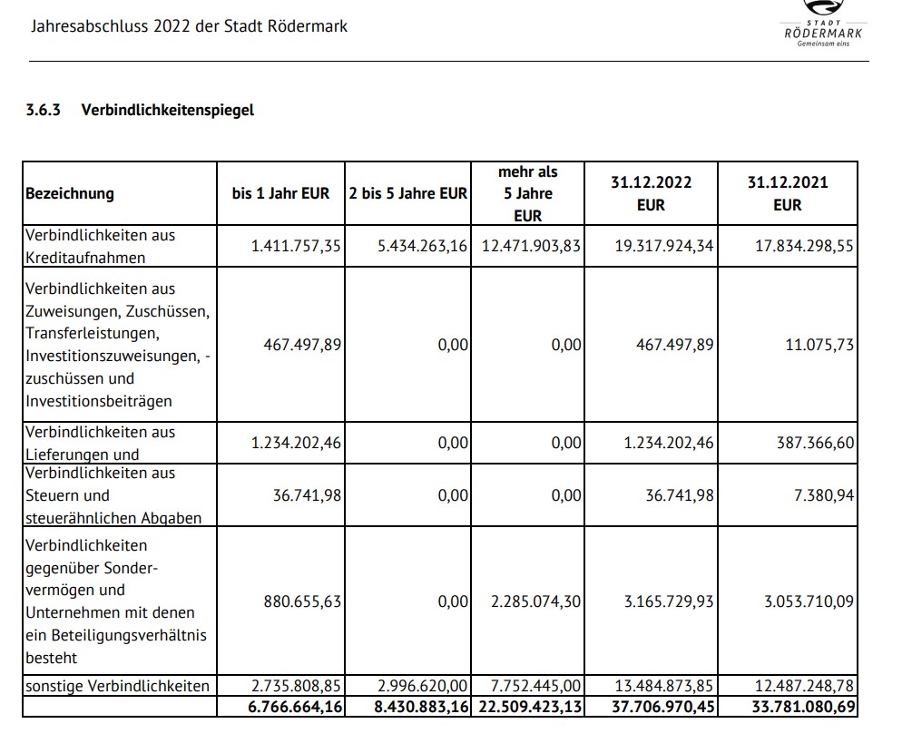 Rödermark ohne KBR. Verbindlichkeiten gegenüber Kreditinstituten