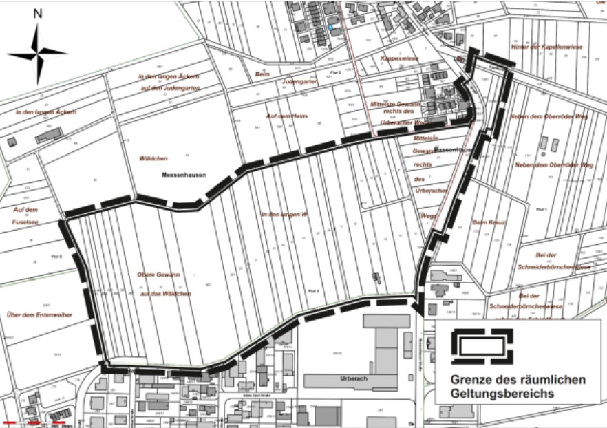 Der räumliche Geltungsbereich umfasst die Flurstücke Gemarkung Messenhausen, Flur 1, Flurstücke 119/1, 119/4, 120/1, 146 (tlw.), 147/1 (tlw.), 159 (tlw.), 167 (tlw.), Flur 2 Flurstücke 1 bis 3, 4/1, 4/2, 5 bis 20, 22 bis 29, 30/1, 30/2, 31 bis 33, 34/1, 35/5, 35/6, 35/7, 35/8, 36/1, 37/1, 122 bis 124, Gemarkung Urberach, Flur 7, Flurstücke 245/3 sowie 273/1 (tlw.).