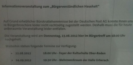 Bürgerbefragung der Stadt Rödermark zum Haushalt 2013. Veranstaltung in Waldacker verschoben.