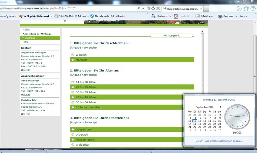 Am Montag, dem 10.9.2012, konnte man den Fragebogen im Internet NICHT mehr beantworten. Eine Info-Box brachte den Hinweis auf die beendete Befragung. Jetzt, am 11.09.2012, kann man wieder an der Umfrage teilnehmen.