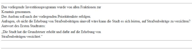 Meiner Meinung nach besteht dieser Zustand – 40 Punkte der Grundsteuer B sind als Strassenbeiträge zu betrachten – weiterhin weil der Beschluss NICHT aufgehoben wurde.