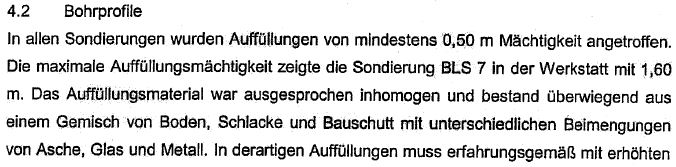 Bei dem vorgefundenen Baugrund handelt es sich um künstlich aufgefüllten Boden mit Fremdmaterialien (Niedertemperaturschlacken, Abbruchmaterialien u.a.) mit einer Mächtigkeit von mindestens 1 m.