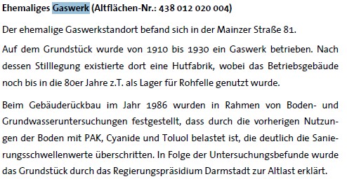 Auch in Ober-Roden ist der Boden auf dem alten Gaswerksgelände mit PAK flächig belastet – vor allem am Standort des ehemaligen Gasometers und im Bereich der alten Teergrube. Außerdem wurden Ablagerungen von cyanidhaltiger Gasreinigermasse, sogenanntes „Berliner Blau“ gefunden.