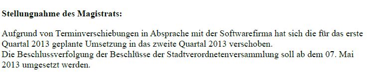 Durch dieses Berichtswesen wird eine Misere aufgedeckt. Alle unbearbeiteten Anträge/Anfragen an den Magistrat bzw. die Verwaltung sind gelistet und für jeden sichtbar.