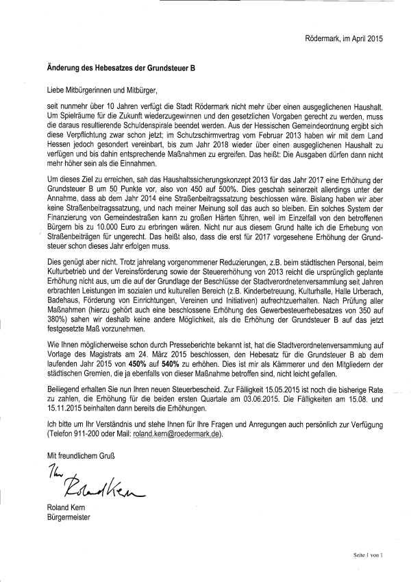 Einige Nachfragen betreffen den Brief von BM Roland Kern, der dem Grundsteuerbescheid beigelegt wurde. Interessant ist auch, einige haben den Brief ohne zu lesen im Papierkorb entsorgt und wundern sich jetzt darüber, dass Ihnen einige Informationen fehlen. Für all diejenigen, die den Brief entsorgt haben. Hier das Begleitschreiben zum Grundsteuerbescheid.