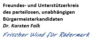 Karsten Falk diskutiert mit Bürgern. Nun ist es amtlich: Bürgermeister Roland Kern hat seinen Rückzug zum 30. Juni 2019 erklärt. Der parteilose, unabhängige Bürgermeisterkandidat Dr. Karsten Falk hat sich daher zum Ziel gesetzt, in den nächsten Wochen mit Bürgern in allen Stadtteilen Rödermarks zu diskutieren, um dann auf Basis dieser Diskussionen sein endgültiges Wahlprogramm für die vermutlich Ende März stattfindende Bürgermeisterwahl zu erstellen. Die einzelnen Veranstaltungen werden jeweils vorgegebene Themenbereiche umfassen. Den Anfang macht am Dienstag, den 20. November 2018 der Stadtteil Ober-Roden. Alle interessierten Bürger sind herzlich eingeladen, ab 19:30 Uhr in der Gaststätte der Turnerschaft Ober-Roden (Obergeschoss) in der Friedrich-Ebert-Straße mit dem bisher einzigen parteilosen Bewerber für das Amt des Bürgermeisters, dem zweifachen Familienvater und Bereichsleiter Betreutes Wohnen & Flüchtlingshilfe der Johanniter-Unfall-Hilfe Karsten Falk, zu diskutieren. Themen an diesem Abend werden sein: Infrastruktur, Freizeit, Sport/Kultur, Ehrenamt/Bürgerschaftliches Engagement und Verwaltung/Bürgerservice. Neugierig geworden? Dann kommen Sie doch vorbei! Der Freundes- und Unterstützerkreis von Dr. Falk freut sich über jeden Bürger, der diese Gelegenheit nutzen möchte, um den Bürgermeisterkandidaten kennenzulernen und ihm seine Meinungen, Anregungen oder auch Sorgen mitzuteilen.