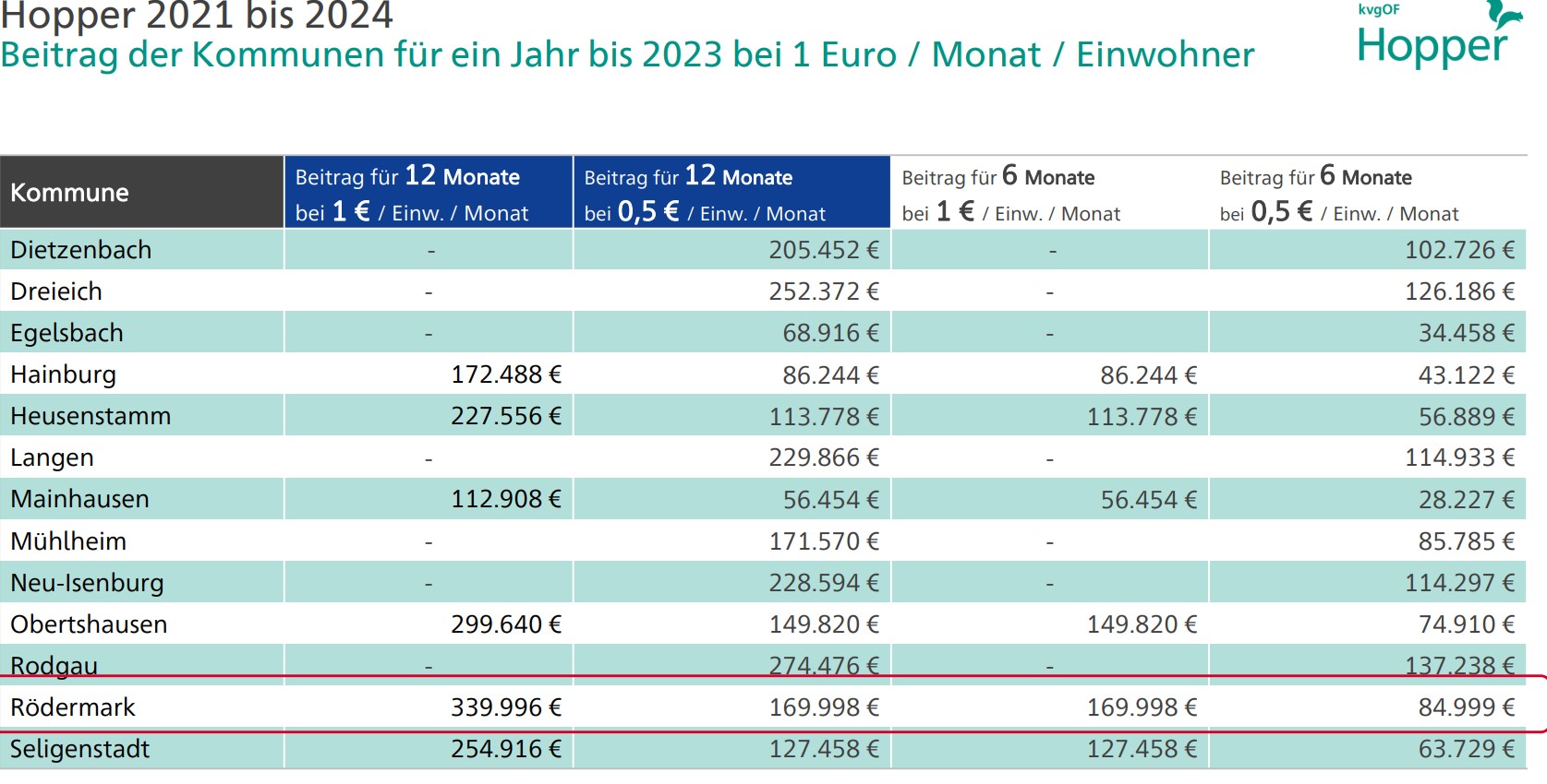 Dem Finanzierungsschlüssel (vgl. Seite 4 der Begründung oder Kapital 5 ab Seite 33 im Umsetzungskonzept) und dem aus der Beteiligung am „Hopper“ resultierenden Betrag pro Halbjahr von 169.998 Euro für die Stadt Rödermark bis Ende 2022 sowie von 84.999 Euro pro Halbjahr bis Ende 2023 wird zugestimmt, die vollständige Finanzierung des „Hopper“ über die kvgOF ab dem Jahr 2024 wird begrüßt.