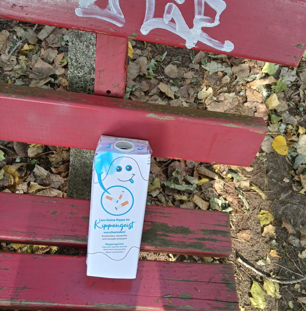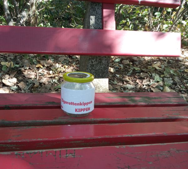 Die an einem Mülleimer angebrachten Aschenbecher halte ich für bedingt sinnvoll. An den im Wald und Feld aufgestellten Ruhebänken dürfte ein Glas oder ähnliches Gefäß sinnvoller sein. Hat man seine Zigarette geraucht, muss man nicht aufstehen, um die Kippe am Mülleimer auszudrücken. Dann nimmt man doch bequemeren Weg. Ab auf den Boden.