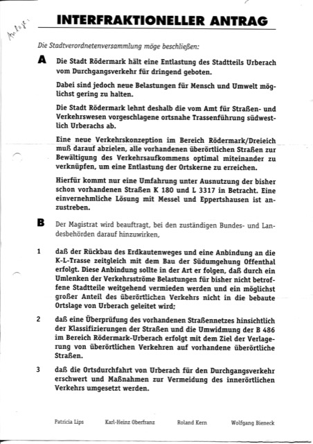 Eine solche ortsnahe Schnellstraße hatte die Stadtverordneten-Versammlung in einem interfraktionellen Beschluss bereits 1997 allstimmig abgelehnt. Indem diese Trasse jedoch in den „vordringlichen Bedarf“ des „Bundesverkehrswegeplans“ aufgerückt ist, besteht auch die gesetzliche Verpflichtung u. a. der Straßenbau-Behörde „Hessen Mobil“, deren bereits vor über zwei Jahrzehnten durchgeführte Planungen wieder aufzunehmen.