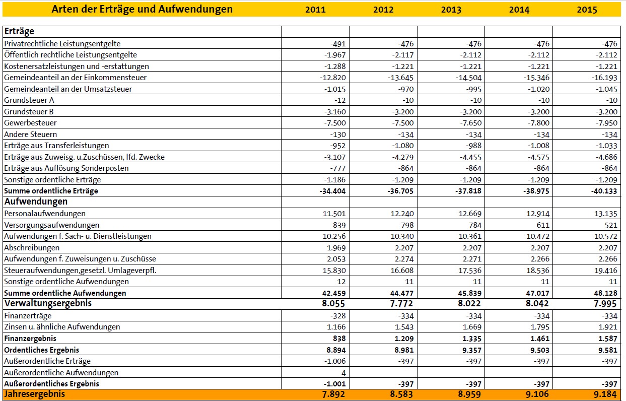 | Arten der Erträge und Aufwendungen | 2011 | 2012 | 2013 | 2014 | 2015 |