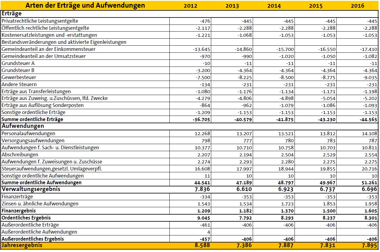 | Arten der Erträge und Aufwendungen | 2012 | 2013 | 2014 | 2015 | 2016 |